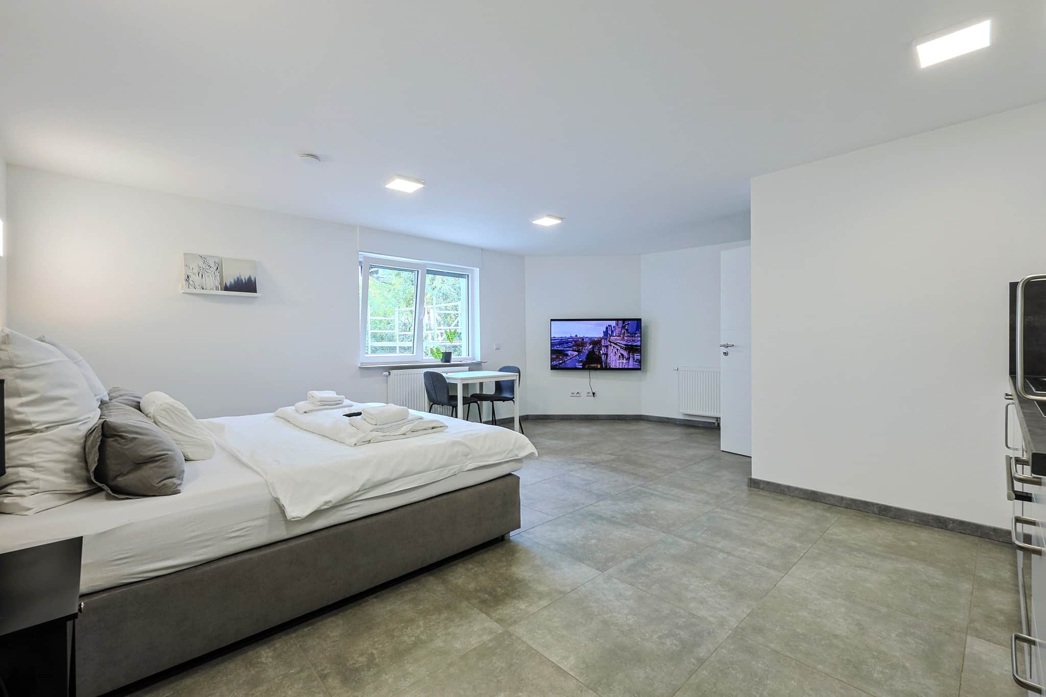 This newly renovated studio offers modern comforts and a cozy atmosphere. The sleeping area with a bed guarantees restful nights. The modern kitchen is fully equipped and features a stove, dishwasher, refrigerator, and a dining area that invites you to relax. The studio is quietly located, yet only a few minutes from the center – ideal for a relaxing stay.